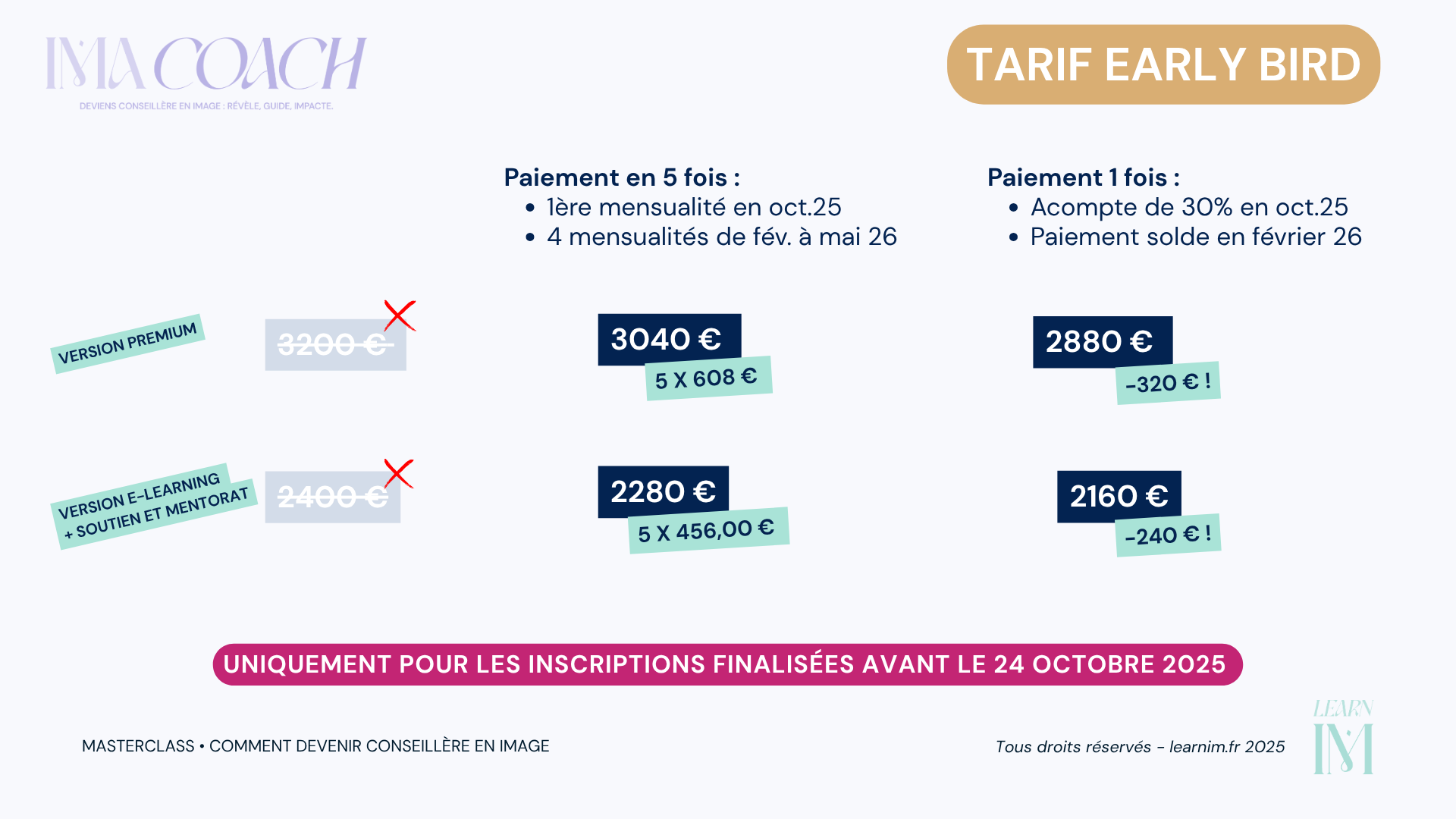 IMACOACH n’est pas éligible au CPF puisqu’il intègre des modules de formation qui vont au-delà des techniques de conseil en image classiques. En intégrant IMACOACH tu as un module complet sur la posture de l’accompagnant, l’image et la transition professionnelle, la valorisation par les qualités et le lancement d’activité.