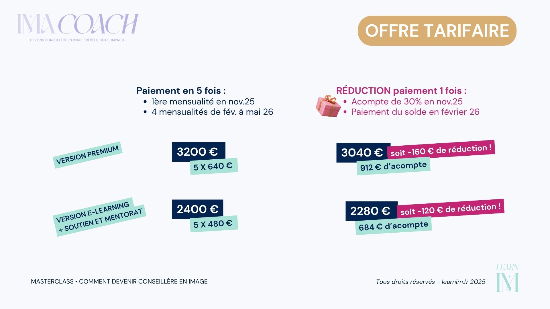 IMACOACH n'est pas éligible au CPF puisqu’il intègre des modules de formation qui vont au-delà des techniques de conseil en image classiques. En intégrant IMACOACH tu as un module complet sur la posture de l'accompagnant, l'image et la transition professionnelle, la valorisation par les qualités et le lancement d'activité.